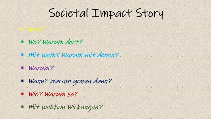 Ja, gesellschaftliche Wirkungen lassen sich zwar in der Regel nicht zählen, aber sich lassen sich erzählen. Wenn es auch für das, was heute als societal impact stories bekannt geworden ist, noch keine allseits akzeptierten Standards gibt, so gibt es doch Überlegungen dazu: Warum und wie fassen wir sie ab? Wo veröffentlichen wir sie mit welcher Wirkung? Worauf sollte man achten? Nach dem Impuls diskutieren wir gern Eure/Ihre Fragen!